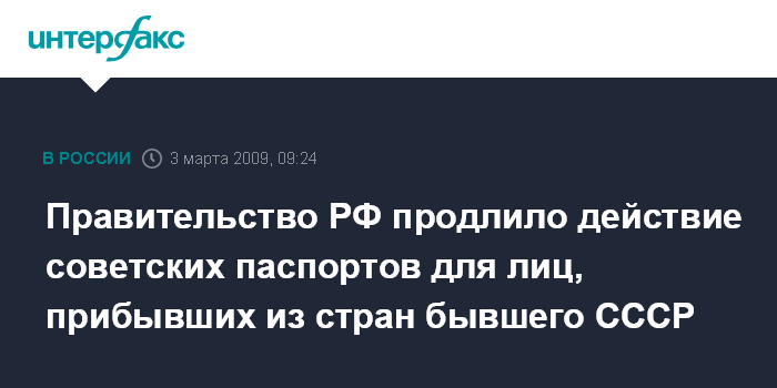 В соответствии с постановлением правительства, подписанным премьером Владимиром Путиным, до 1 июля будут действовать паспорта иностранных граждан, "имевших гражданство СССР, прибывших в Российскую Федерацию из государств, входивших в состав СССР, и зарегистрированных по месту жительства в Российской Федерации по состоянию на 1 июля 2002 года для постоянного проживания в РФ".