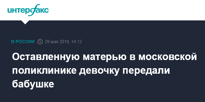Москва. 29 мая. INTERFAX.RU - Девочку, оставленную матерью в московской поликлинике 16 мая, в среду выписали из больницы и передали в семью бабушки по отцовской линии, сообщили "Интерфаксу" в пресс-службе департамента труда и соцзащиты населения Москвы.