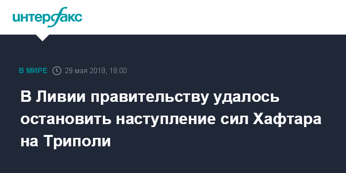 Москва. 29 мая. INTERFAX.RU - Силам правительства национального согласия Ливии удалось остановить в пригородах ливийской столицы продвижение Ливийской национальной армии (ЛНА) под командованием Халифы Хафтара, сообщает в среду Анатолийское агентство новостей.