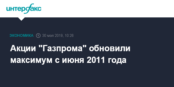 Москва. 30 мая. INTERFAX.RU - Акции "Газпрома" ускорили рост на торгах "Московской биржи" после публикации отчета за I квартал 2019 года по МСФО, оказавшегося лучше ожиданий аналитиков; бумаги компании подорожали в начале торгов почти на 2,5%, достигнув 212,25 рубля за штуку, обновив тем самым максимум с июня 2011 года.