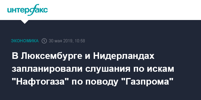 Москва. 30 мая. INTERFAX.RU - Предварительные слушания по иску "Нафтогаза Украины" к люксембургским подразделениям крупнейших банков и "Газ Капитал С.А." об аресте любой задолженности и активов "Газпрома" в Люксембурге запланированы на июнь 2019 года, сообщил "Газпром" в своей квартальной отчетности по МСФО.