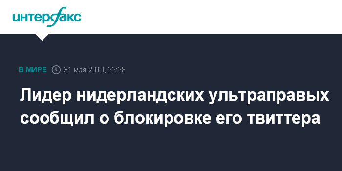 Москва. 31 мая. INTERFAX.RU - Лидер нидерландской националистической "Партии свободы" Герт Вилдерс в пятницу сообщил, что руководство соцсети Twitter заблокировало его аккаунт за высказывания в адрес политического соперника.