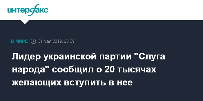 Москва. 31 мая. INTERFAX.RU - Глава партии "Слуга народа" Дмитрий Разумков сообщил, что около 20 тысяч человек уже выразили свое желание стать членами партии.