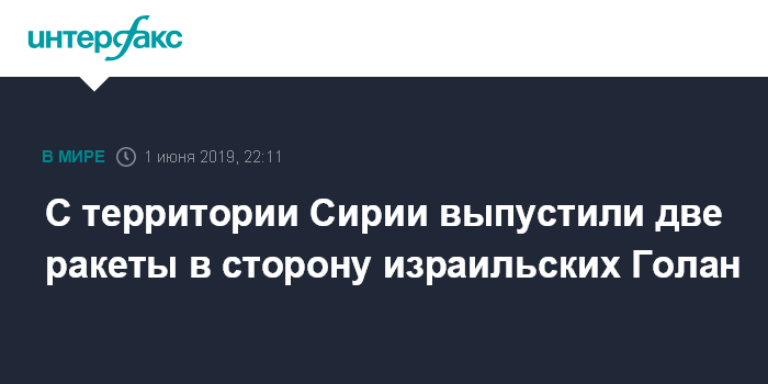 Москва. 1 июня. INTERFAX.RU - Две ракеты выпущены в субботу с территории Сирии в сторону контролируемых Израилем Голанских высот, сообщает газета The Jerusalem Post со ссылкой на пресс-службу армии Израиля.