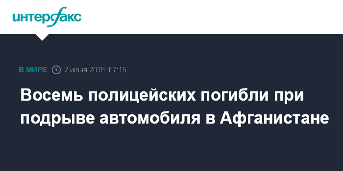 Москва. 2 июня. INTERFAX.RU - По меньшей мере восемь полицейских погибли, девять пострадали в воскресенье в результате подрыва автомобиля в провинции Газни на востоке Афганистана, сообщило агентство Xinhua со ссылкой на местные власти.