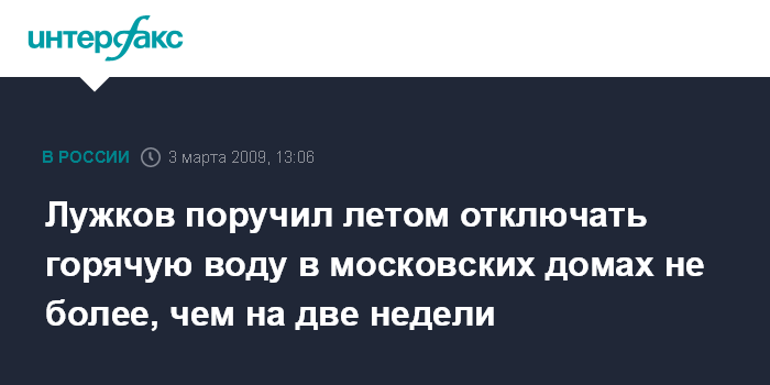 Так Лужков прокомментировал информацию, озвученную на заседании первым заместителем мэра Петром Бирюковым, который сообщил, что более 90% домов в Москве летом будет отключено от горячей воды на срок не более 14 дней. Теперь планируется распространить эту норму на все здания в городе.