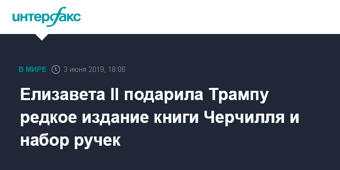 Москва. 3 июня. INTERFAX.RU - Королева Великобритании Елизавета II подарила президенту США Дональду Трампу редкое издание книги Уинстона Черчилля "Вторая мировая война". Об этом ВВС News сообщили в пресс-службе Букингемского дворца.