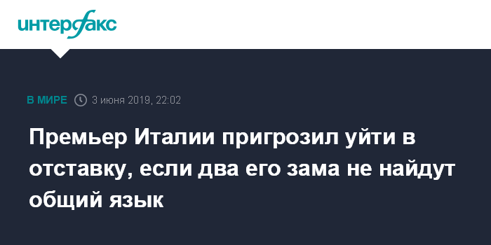 Москва. 3 июня. INTERFAX.RU - Премьер-министр Италии Джузеппе Конте в понедельник призвал партии "Движение 5 звезд" и "Лига", входящие в правящую коалицию, отказаться от разногласий, пригрозив в противном случае уйти в отставку.