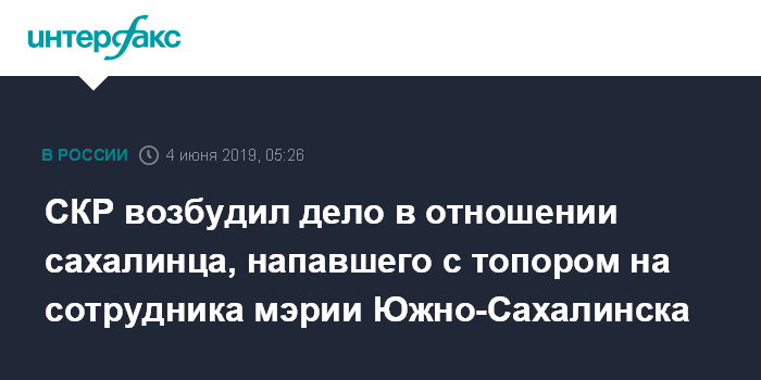 Москва. 4 июня. INTERFAX.RU - В отношении сахалинца, напавшего в понедельник днем с топором на сотрудника мэрии Южно-Сахалинска в здании городской администрации, возбуждено уголовное дело, сообщает пресс-служба СУ СКР по региону.