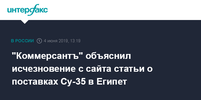 Ранее журнал Forbes обратил внимание на то, что с сайта "Коммерсантъ" исчезла статья о поставке Россией истребителей Су-35 в Египет, предположив, что это может быть связано с административным протоколом, составленным в отношении издания. Однако источник "Интерфакса" в ИД это отрицает.