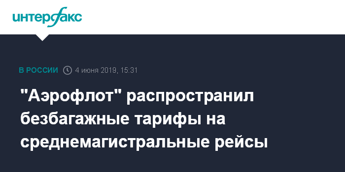 Москва. 4 июня. INTERFAX.RU - "Аэрофлот" распространяет действие безбагажных тарифов на среднемагистральную маршрутную сеть, говорится в сообщении ПАО "Аэрофлот" во вторник.
