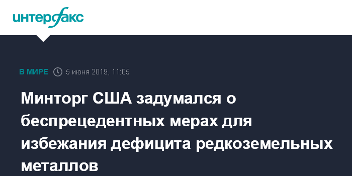 Москва. 5 июня. INTERFAX.RU - Министерство торговли США пообещало принять беспрецедентные меры для обеспечения того, чтобы страна не оказалась отрезанной от поставок редкоземельных металлов (РЗМ).