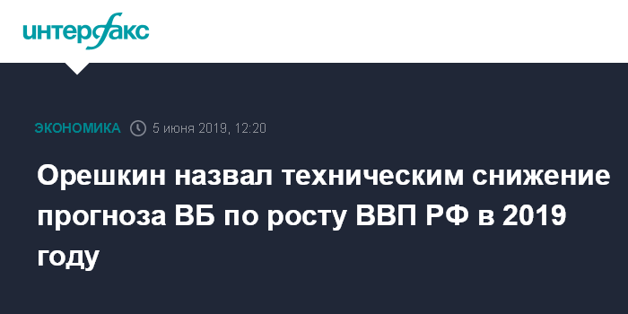 Москва. 5 июня. INTERFAX.RU - Понижение Всемирным банком прогноза по росту ВВП РФ в 2019 году с 1,5% до 1,2% носит технический характер и во многом связано со снижением ожиданий роста мировой экономики до 2,6% с 2,9%, сказал журналистам глава Минэкономразвития РФ Максим Орешкин.