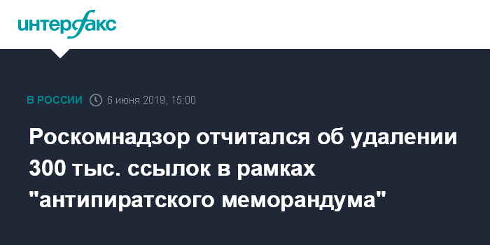 Москва. 6 июня. INTERFAX.RU - Более 300 тысяч ссылок на пиратские ресурсы и их "зеркала" удалены из реестра, созданного после подписания меморандума о совместной борьбе с пиратством между правообладателями и интернет-площадками. Об этом сообщил глава Роскомнадзора Александр Жаров.