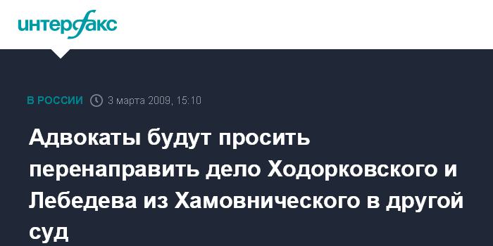 Москва. 3 марта. INTERFAX.RU - Адвокаты экс-главы НК "ЮКОС" Михаила Ходорковского и МФО "МЕНАТЕП" Платона Лебедева считают, что новое уголовное дело в отношении их подзащитных не должен рассматривать Хамовнический суд Москвы по территориальной подсудности.