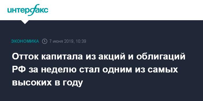 Москва. 7 июня. INTERFAX.RU - Отток капитала из акций и облигаций РФ с 30 мая по 5 июня 2019 года оказался одним из самых высоких с начала года, говорится в обзоре главного стратега компании "БКС Глобал Маркетс" Вячеслава Смольянинова.