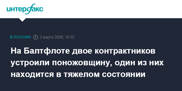 Москва. 3 марта. INTERFAX.RU - На Балтийском флоте в результате личного конфликта два военнослужащих контрактной службы нанесли друг другу ножевые ранения, сообщил "Интерфаксу" во вторник источник в штабе БФ. "В одной из частей БФ два военнослужащих контрактника повздорили между собой. Конфликт перерос в поножовщину, в результате которой оба получили ранения различной тяжести", - рассказал собеседник агентства.