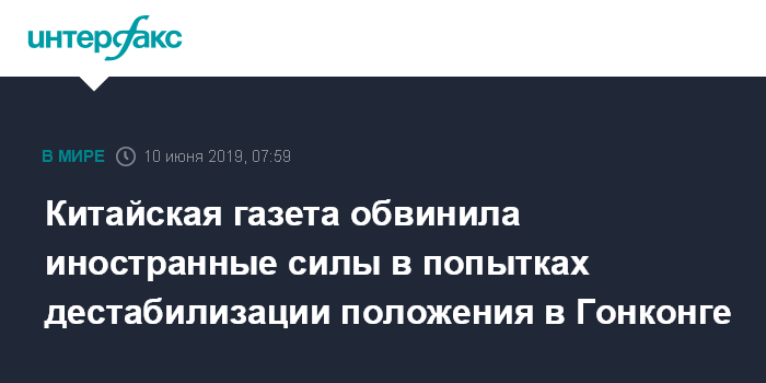 Москва. 10 июня. INTERFAX.RU - Определенные зарубежные силы пытаются путем поддержки протестных выступлений в Гонконге посеять хаос в этом специальном административном районе (САР) Китая, пишет в понедельник англоязычная китайская газета China Daily.