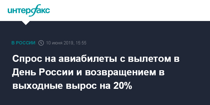 Спрос на авиабилеты с вылетом в День России и возвращением в выходные вырос на 20%