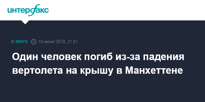 Москва. 10 июня. INTERFAX.RU - Один человек погиб в понедельник в результате неудачной посадки вертолета на крышу Manhattan Midown Building - 54-этажного здания в нью-йоркском районе Манхэттен, сообщает со ссылкой на городскую спасательную службу американский телеканал CNN.