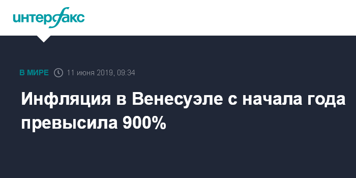 Москва. 11 июня. INTERFAX.RU - Инфляция в Венесуэле с начала года составила более 900%, сообщил депутат Национальной ассамблеи (парламента страны - ИФ) Анхель Альварадо.