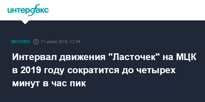 Москва. 11 июня. INTERFAX.RU - Интервал движения поездов "Ласточка" по Московскому центральному кольцу (МЦК) в час пик сократится до четырех минут, в остальное время - до восьми минут, сообщили РЖД.