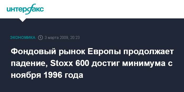Индекс Dow Jones Stoxx 600 упал к 19:53 мск на 1,8% - до 161,34 пункта - минимального уровня с ноября 1996 года. В 2009 году этот фондовый индикатор потерял уже 19%.