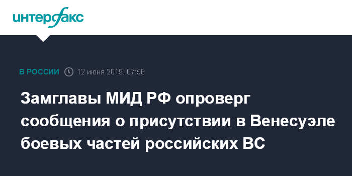 Москва. 12 июня. INTERFAX.RU - Россия не направляла в Венесуэлу боевые подразделения или спецназ российских Вооруженных сил (ВС) для поддержки президента Николаса Мадуро, завил замминистра иностранных дел РФ Сергей Рябков, опровергая в интервью Wall Street Journal появившиеся сообщения на эту тему.