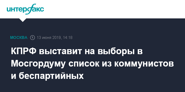 Москва. 13 июня. INTERFAX.RU - КПРФ пойдет на выборы в Мосгордуму со списком кандидатов из коммунистов и беспартийных, сообщил депутат Госдумы, первый секретарь Московского горкома партии Валерий Рашкин.
