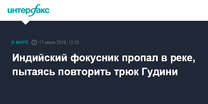 Москва. 17 июня. INTERFAX.RU - Индийский фокусник пытался повторить трюк знаменитого Гарри Гудини, прыгнув в реку в наручниках. Однако, фокус не удался, сообщает "Би-би-си".