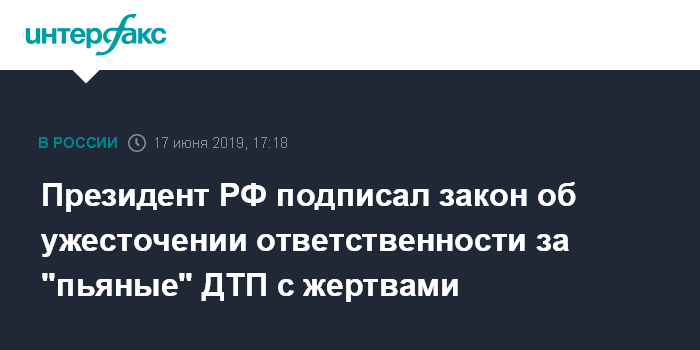 Москва. 17 июня. INTERFAX.RU - Президент РФ Владимир Путин подписал закон об ужесточении уголовной ответственности за гибель людей в дорожно-транспортном происшествии по вине пьяного водителя. Об этом сообщается на официальном портале правовой информации.