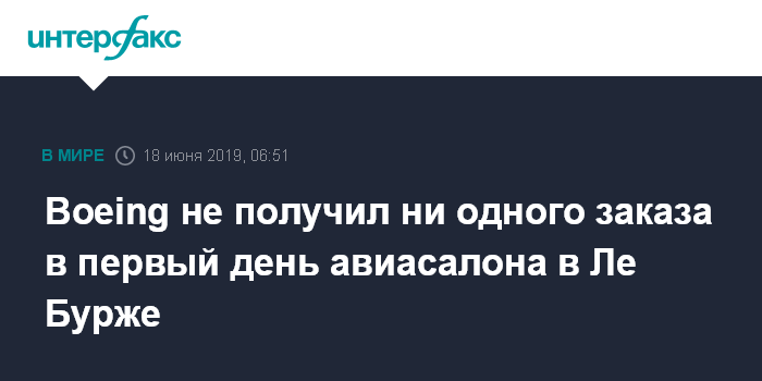 Москва. 18 июня. INTERFAX.RU - Компания Boeing в первый день авиасалона Ле Бурже не сообщила ни об одном новом заказе на самолеты, сообщает телеканал CNBC.