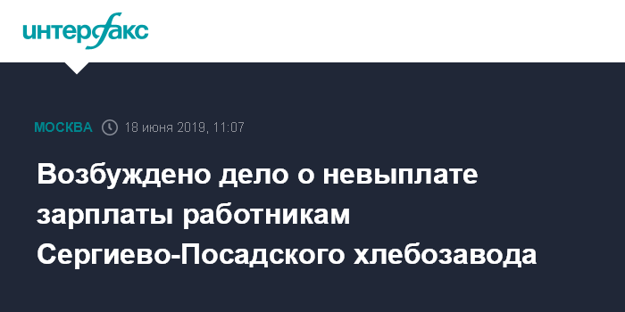 Москва. 18 июня. INTERFAX.RU - Уголовное дело о невыплате заработной платы на 14 млн рублей работникам АО "Сергиево-Посадский хлебокомбинат" возбуждено в Московской области, сообщили в пресс-службе областного главка СКР.