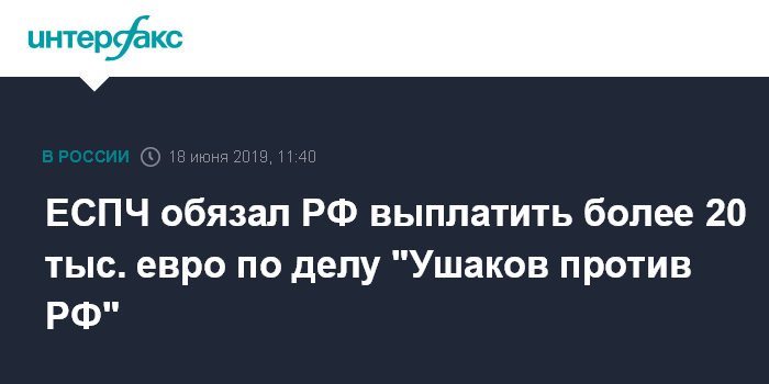 Москва. 18 июня. INTERFAX.RU - Европейский суд по правам человека (ЕСПЧ) вынес решение по делу "Владимир Ушаков против РФ", в соответствии с которым он присудил истцу компенсацию в общей сложности в размере 23 тысячи 50 евро, говорится в судебном коммюнике, распространенном во вторник.
