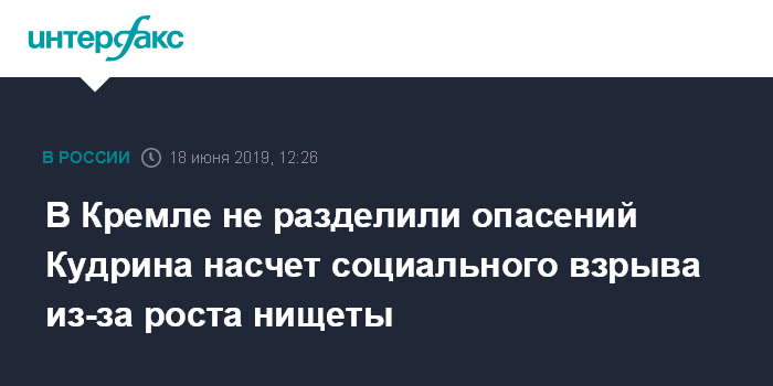 Москва. 18 июня. INTERFAX.RU - В Кремле не согласны с опасениями главы Счетной палаты Алексея Кудрина по поводу роста нищеты в РФ, который может привести к социальному взрыву.