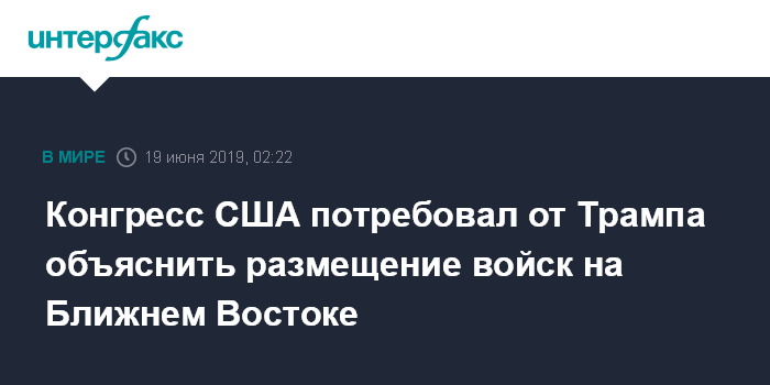 Москва. 19 июня. INTERFAX.RU - Республиканцы и демократы Сената США призвали президента Дональда Трампа объяснить свое решение о размещении дополнительных американских войск на Ближнем Востоке и предупредили, что Конгресс не санкционировал военные действия против Ирана.