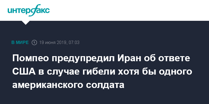 Москва. 19 июня. INTERFAX.RU - Госсекретарь США Майк Помпео предупредил иранских лидеров, что любое нападение Тегерана или его доверенных лиц, в результате которого погибнет хотя бы один американский военнослужащий, приведет к военной контратаке со стороны США, сообщает The Washington Post со ссылкой на чиновников.