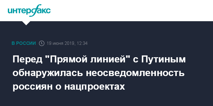 Москва. 19 июня. INTERFAX.RU - Суть многих обращений граждан в преддверии прямой линии с президентом РФ Владимиром Путиным показывают, что они недостаточно информированы о нацпроектах.