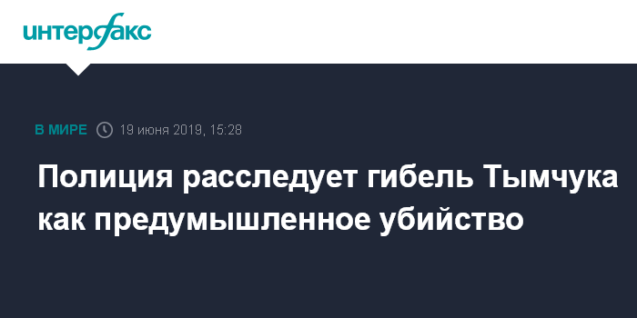 Москва. 19 июня. INTERFAX.RU - По факту гибели депутата Верховной рады, координатора "Информационного сопротивления" Дмитрия Тымчука полиция возбудила уголовное дело по статье об умышленном убийстве (статья 115 УК). Об этом сообщил руководитель Национальной полиции Украины Сергей Князев, его слова цитирует пресс-служба ведомства.