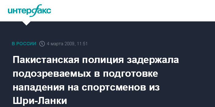 Москва. 4 марта. INTERFAX.RU – Пакистанские полицейские задержали в среду нескольких подозреваемых в организации нападения на команду Шри-Ланки по крикету, сообщает телеканал "Скай-ньюз" со ссылкой на заявление представителя полиции Хаджи Хабибура Рехмана.