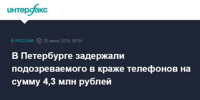 Москва. 20 июня. INTERFAX.RU - В Санкт-Петербурге задержан подозреваемый в краже более 190 телефонов из офиса сотовой связи на северо-западе Москвы на сумму около 4.3 млн рублей, сообщила "Интерфаксу" официальный представитель МВД РФ Ирина Волк.