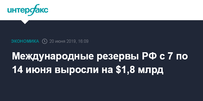 Международные резервы РФ с 7 по 14 июня выросли на $1,8 млрд