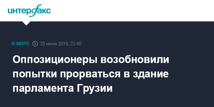 Москва. 20 июня. INTERFAX.RU - Участники митинга в Тбилиси вновь периодически пытаются прорваться в здание парламента, сообщили в четверг вечером грузинские СМИ.