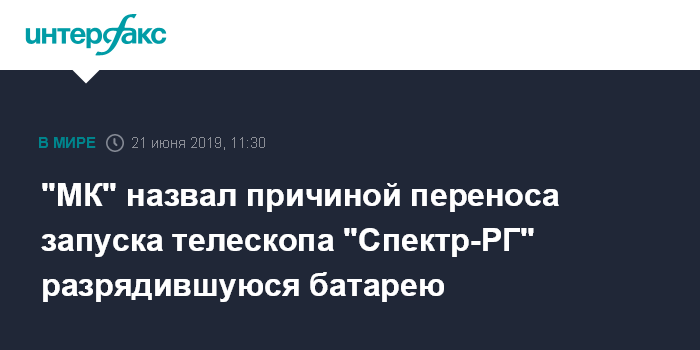 Москва. 21 июня. INTERFAX.RU - Запуск ракеты-носителя "Протон-М" с орбитальным телескопом "Спектр-РГ" перенесли на сутки из-за разрядившейся батареи телескопа. Об этом "Московскому комсомольцу" сообщил источник в космической отрасли.