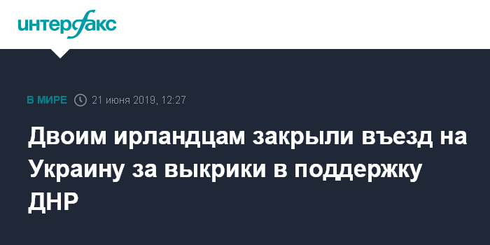 Москва. 21 июня. INTERFAX.RU - Двоим ирландцам на три года закрыли въезд на Украину за то, что в четверг во время посадки самолета в Киеве они достали символику РФ и георгиевские ленты и начали выкрикивать "ДНР, вперед!", сообщила пресс-служба Госпогранслужбы Украины.