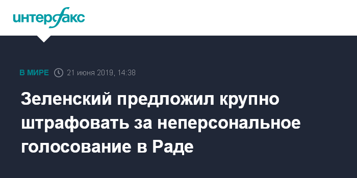 Москва. 21 июня. INTERFAX.RU - Президент Украины Владимир Зеленский внес в Раду законопроект об уголовной ответственности за неперсональное голосование депутатов в парламенте.