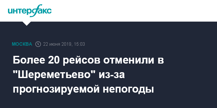 Москва. 22 июня. INTERFAX.RU - Более двух десятков рейсов из московского аэропорта "Шереметьево" отменено в связи с прогнозируемой непогодой, сообщает сайт аэропорта в субботу.