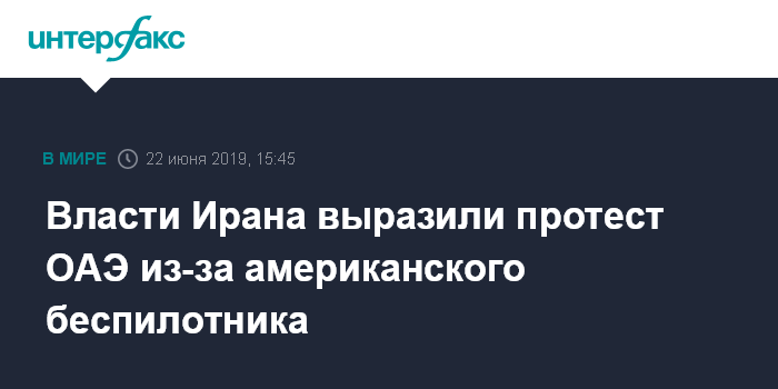 Москва. 22 июня. INTERFAX.RU - МИД Ирана вызвало временного поверенного в делах ОАЭ, чтобы выразить протест из-за того, что американский беспилотник, нарушивший воздушное пространство страны, вылетел с базы в ОАЭ, сообщает в субботу агентство Mehr.