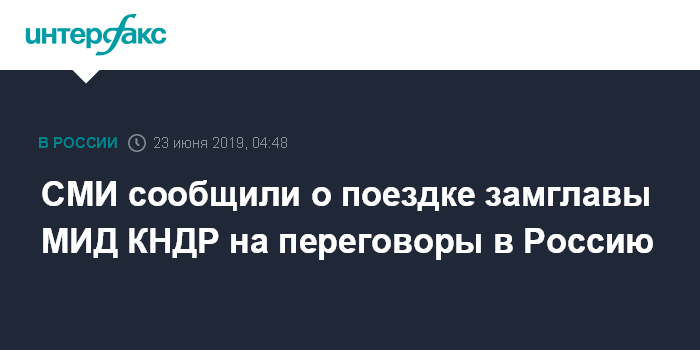 Москва. 23 июня. INTERFAX.RU - Замглавы МИД Корейской Народно-Демократической Республики Им Чхон Иль отправился в Россию на переговоры, сообщает северокорейское агентство ЦТАК. В сообщении отмечается, что северокорейский дипломат планирует провести встречи на уровне заместителей главы внешнеполитического ведомства в Москве.
