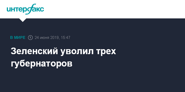Москва. 24 июня. INTERFAX.RU - Президент Украины Владимир Зеленский отправил в отставку глав администраций Житомирской, Ровенской и Черкасской областей Игоря Гундича, Алексея Муляренко и Александра Вельбовца. Такие указы 24 июня опубликовали на сайте главы государства.